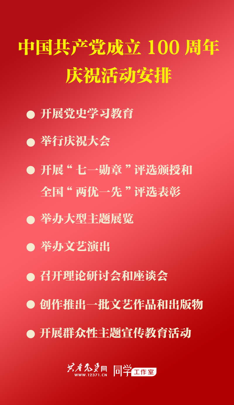 六是召開理論研討會和座談會。中央宣傳部將會同中央組織部、中央黨校(國家行政學(xué)院)、中央黨史和文獻研究院、教育部、中國社會科學(xué)院、軍委政治工作部聯(lián)合召開慶祝建黨100周年理論研討會;中央組織部將召開全國優(yōu)秀共產(chǎn)黨員、優(yōu)秀黨務(wù)工作者、先進基層黨組織代表慶祝建黨100周年座談會,還要召開老黨員老干部座談會和黨的建設(shè)歷史經(jīng)驗研討會;中央統(tǒng)戰(zhàn)部將商各民主黨派中央、無黨派人士和全國工商聯(lián),召開各界人士慶祝中國共產(chǎn)黨成立100周年座談會。